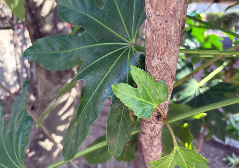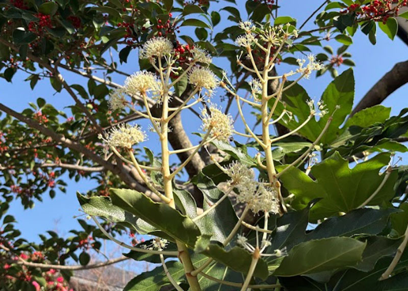お隣の八つ手に花が咲いていた。もっと早く咲いていたのだろうけど見逃したようだ。