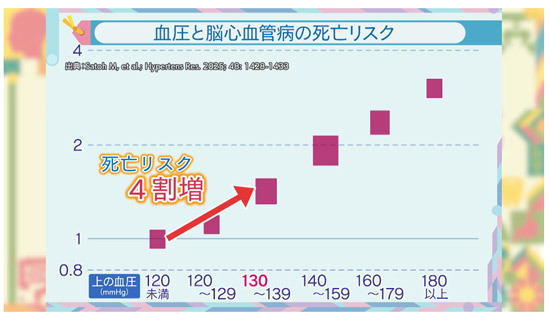 降圧薬を飲んでいない5万8,000人を10年間、追跡した最新研究によると、上の血圧が120mmHg未満の人に比べて、130〜139mmHgの人では、脳心血管病の死亡リスクが4割も上昇することがわかったからだそうだ。